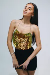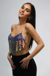 blusa brilhante de lantejoulas furtacor durinhas com correntes reguláveis no decote (pescoço) e na cintura (costas). não é preciso usar nada para cobrir o busto, o peito fica perfeitamente cobertinho pelas lantejoulas. caso se sinta mais confortável, use um lib (adesivo de bico de peito achado em qualquer farmácia).