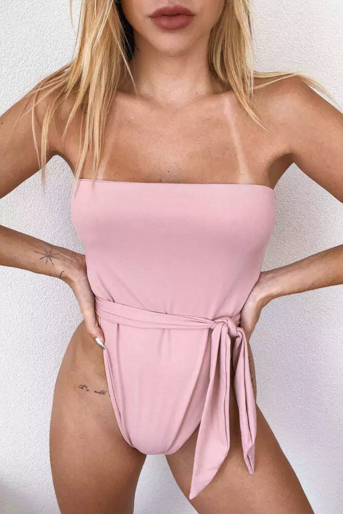 body tomara-que-caia, cavado nas laterais e com amarração na cintura alta.
