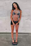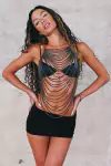 top tipo body chain feito de correntes com ajustes reguláveis no pescoço de nas costas. as correntes envolvem todo o tronco frontal, mantendo as costas abertas.
