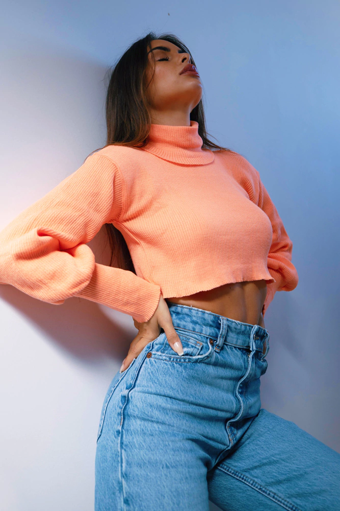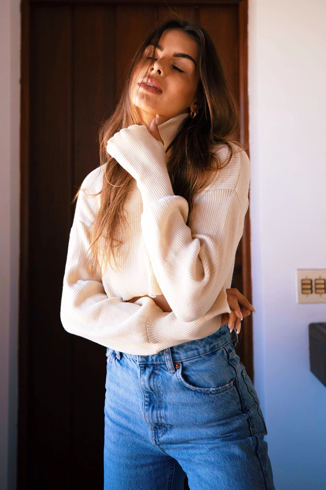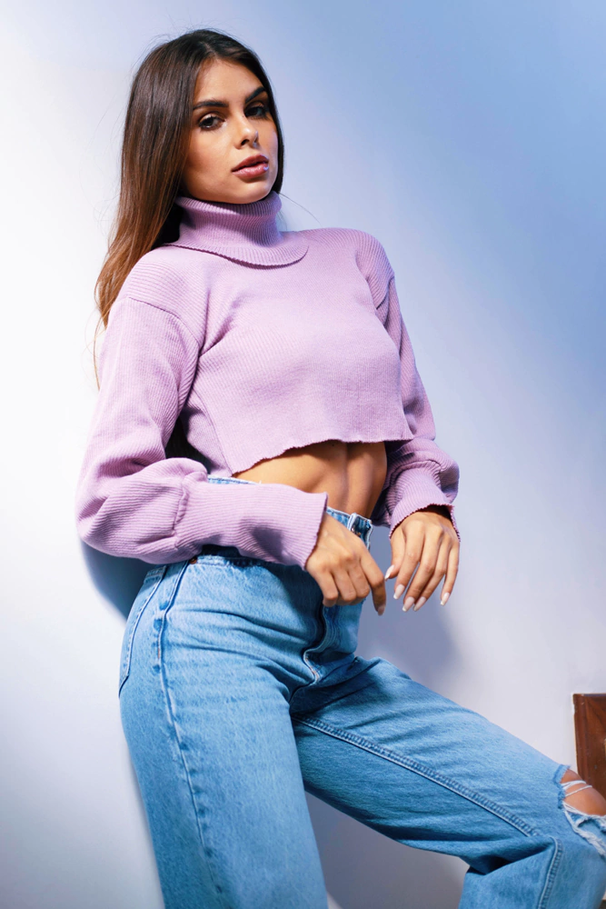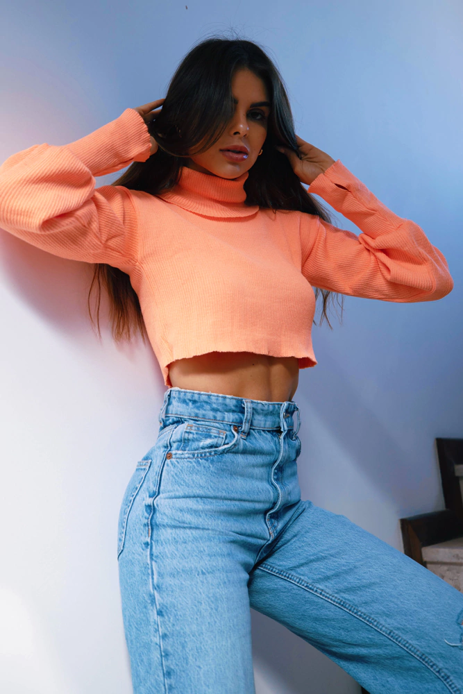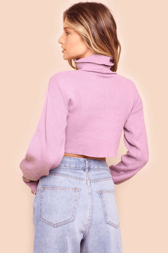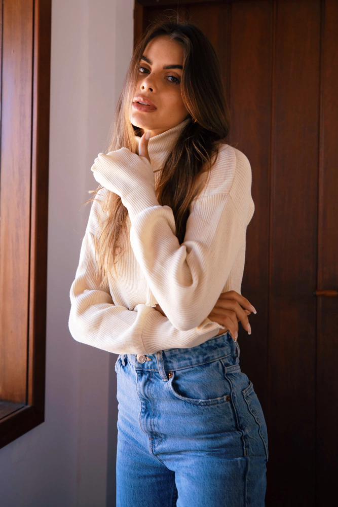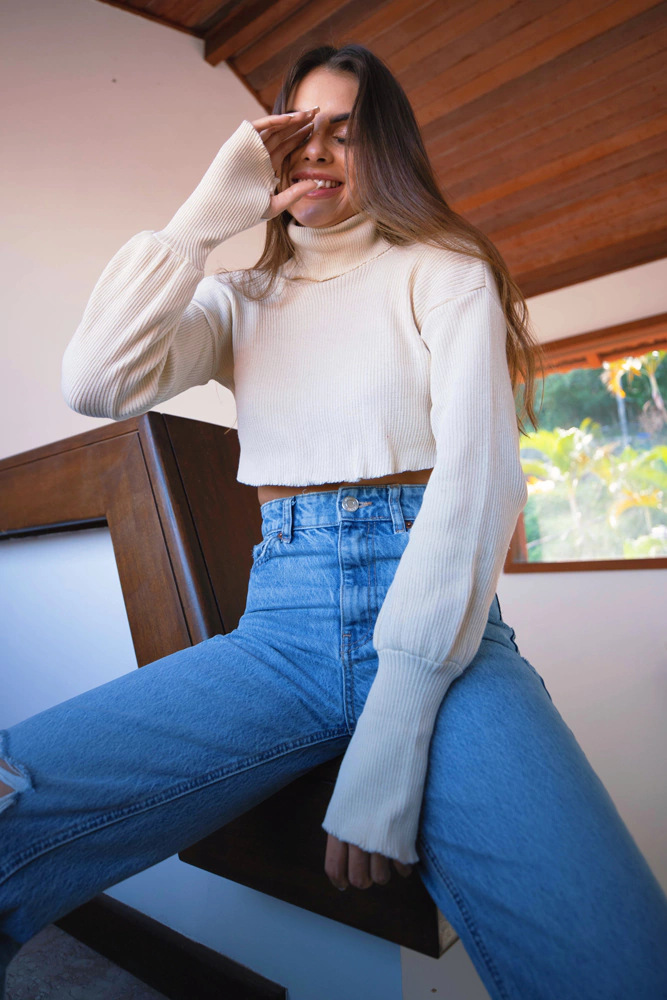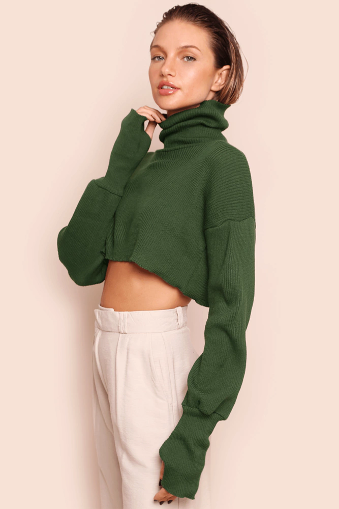cropped de tricot com gola alta e detalhe no punho para encaixe dos dedos para aquecer as mãos em dias mais friozinhos. dá também para arregaçar as mangas e deixar a boca um pouquinho mais larguinha e bufante. o tricot estica bastante.